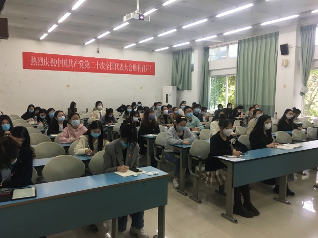 接下来,会上为大家介绍了学校和学院在传达学习二十大精神方面所做的工作,以及对大家的勉励和要求。最后,易乾梅同志在总结活动时,着重指出全体同学要深刻领会党章修改的意义和内容以及伟大建党精神和延安精神的丰富意涵,务必在会后持续学习并践行。通过此次主题党日活动,同学们将进一步领会党章的与时俱进和修改党章的重大意义,进一步感受中国共产党的特质,全面认识“中国共产党为什么能”的深刻逻辑,并将会上的学习领悟付诸实践。